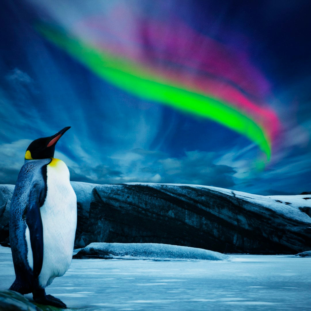 Färgerna grönt, lila och blått ger bilden ett sagolikt utseende, medan pingvinens lugna figur skapar balans och harmoni.