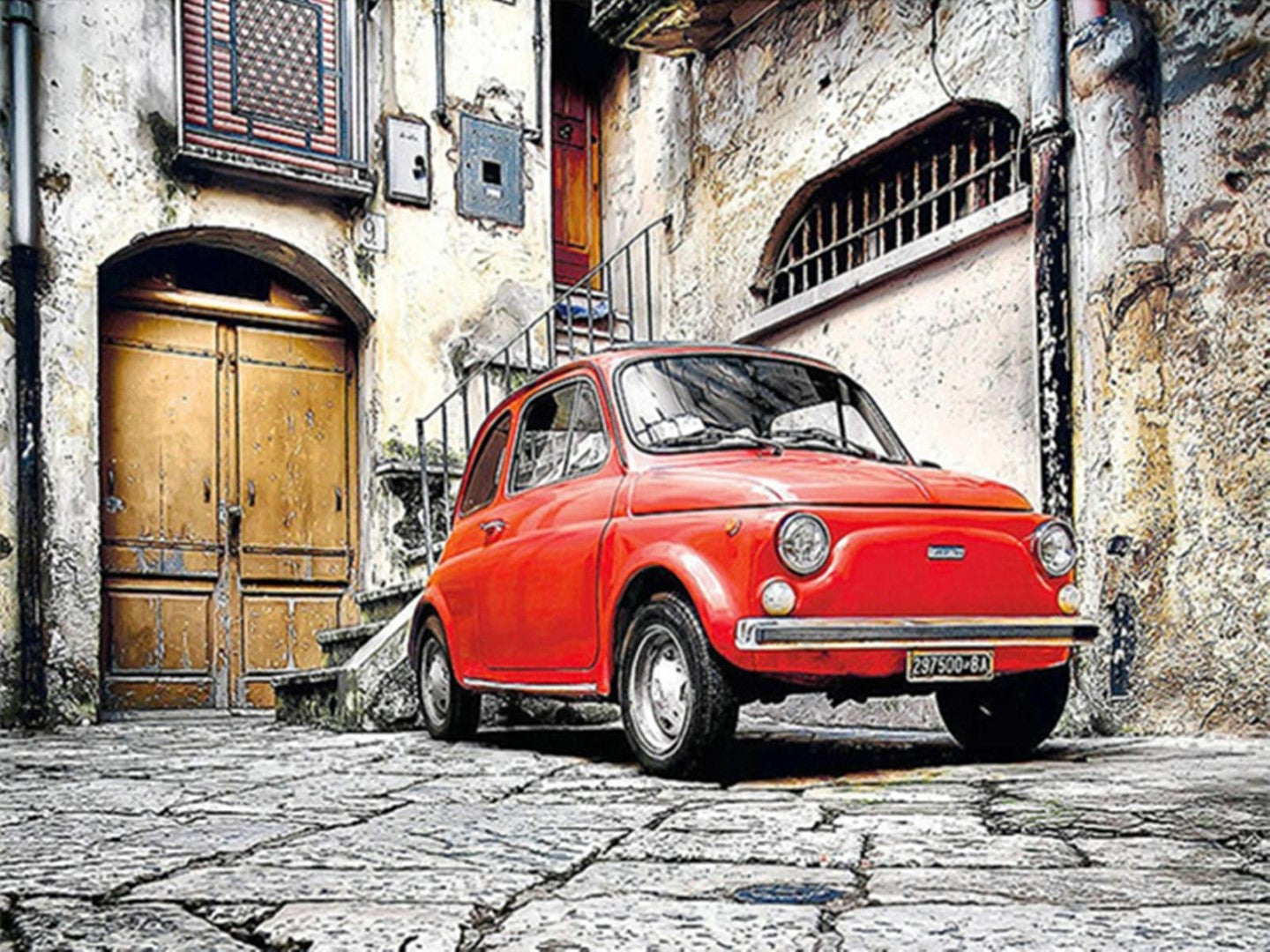 Diamond paint af en lille rød bil i italiensk brostensbelagt baggård.