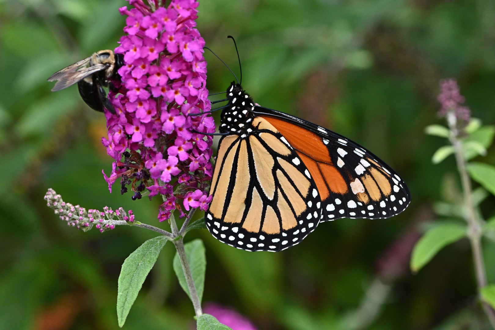 Denne smukke diamond paint-scene viser en elegant sommerfugl og en travl bi, der mødes på en kraftig pink blomst.
