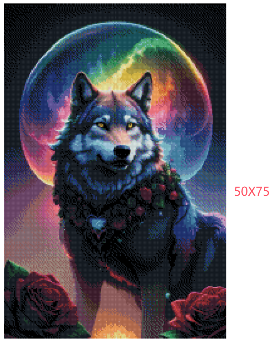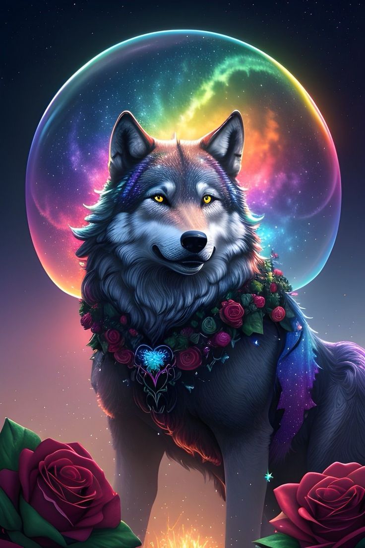 Varg med färgrik måne i bakgrunden