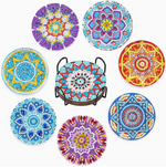 Underläggsset för dricksglas och koppar. Setet innehåller 8 stycken med motiv av vackra rosor i abstrakta färger och en praktisk hållare för förvaring när bitarna inte används. Bakgrunden är mörk vilket ger bitarna ett estetiskt uttryck och gör att motivet, som är i starka färger, framstår som ännu tydligare och vackrare.