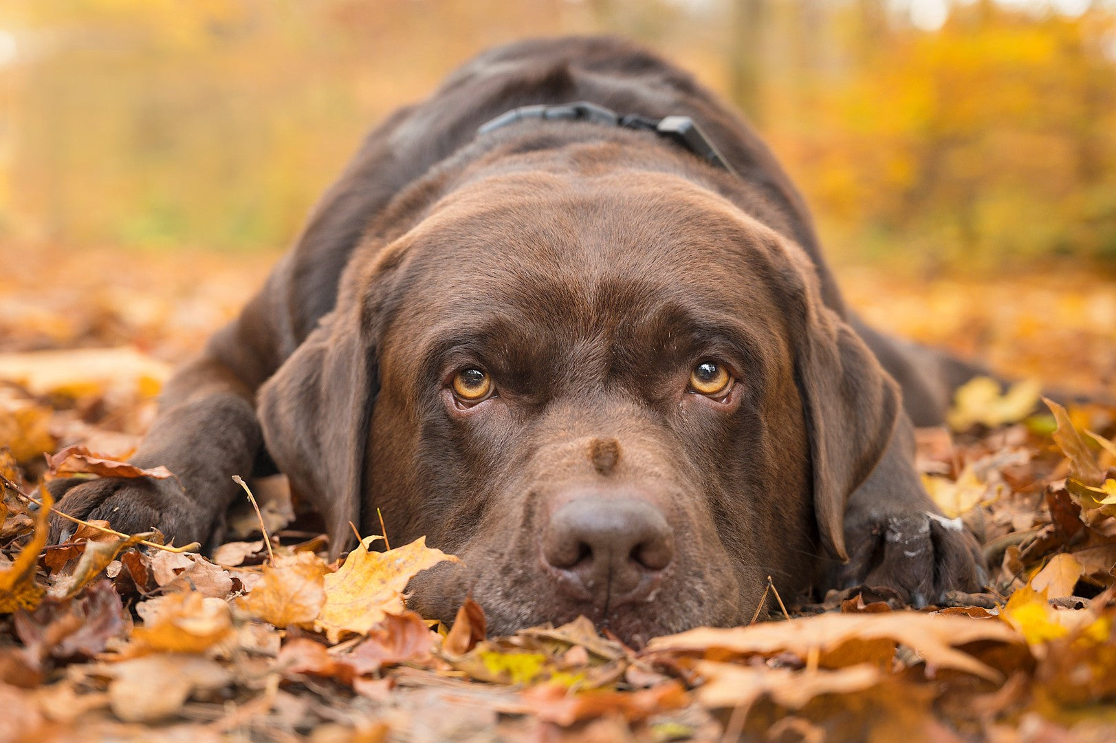 Det trofaste blik og de varme farvetoner skaber en hyggelig og naturlig stemning – perfekt til dyreelskere og alle, der elsker efterårets rolige skønhed.