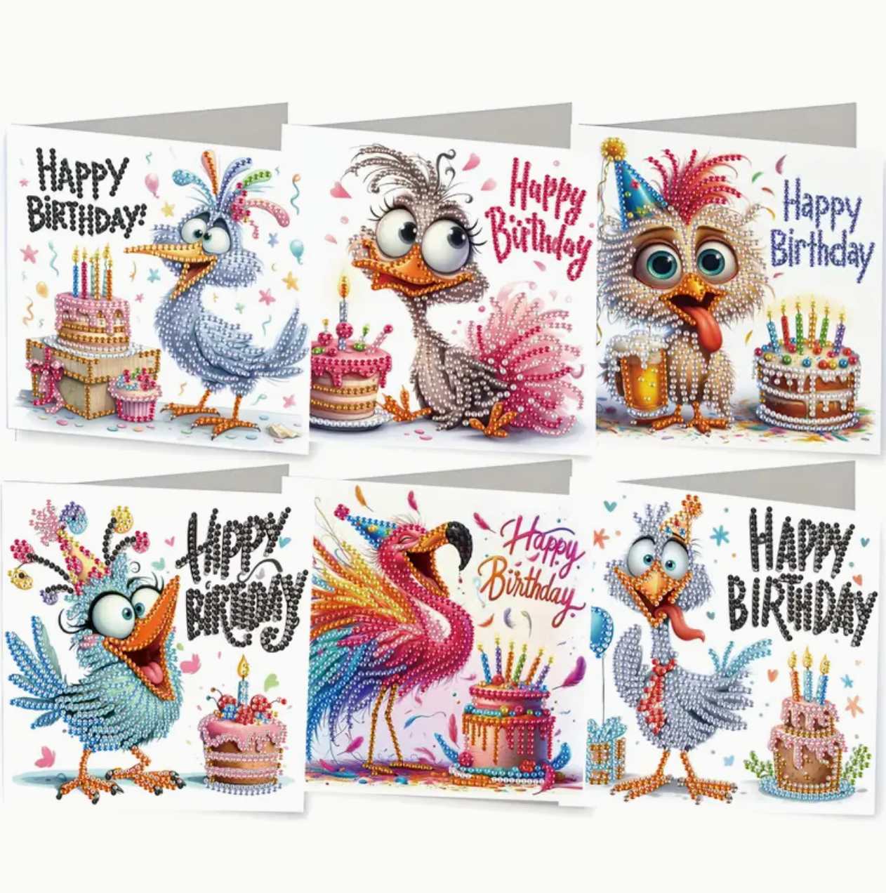 Gør dine fødselsdagshilsner sjovere med dette sæt af 6 forskellige kort med skægge og farverige fugle.
