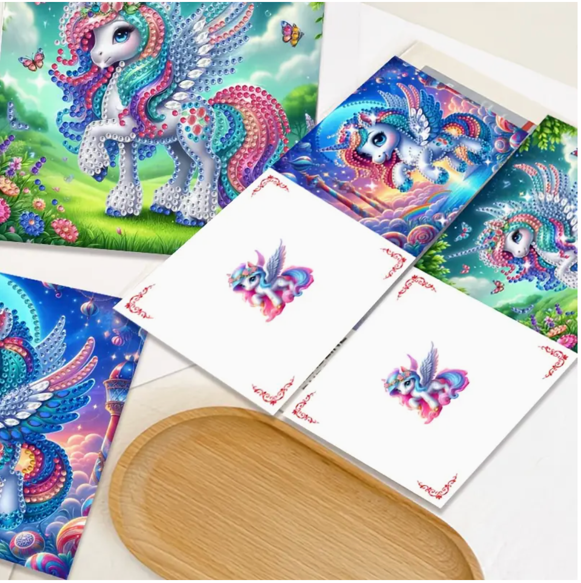 Gør dine fødselsdagshilsner personlige med dette sæt af 6 forskellige diamond paint-kort med flotte og farverige enhjørninger.