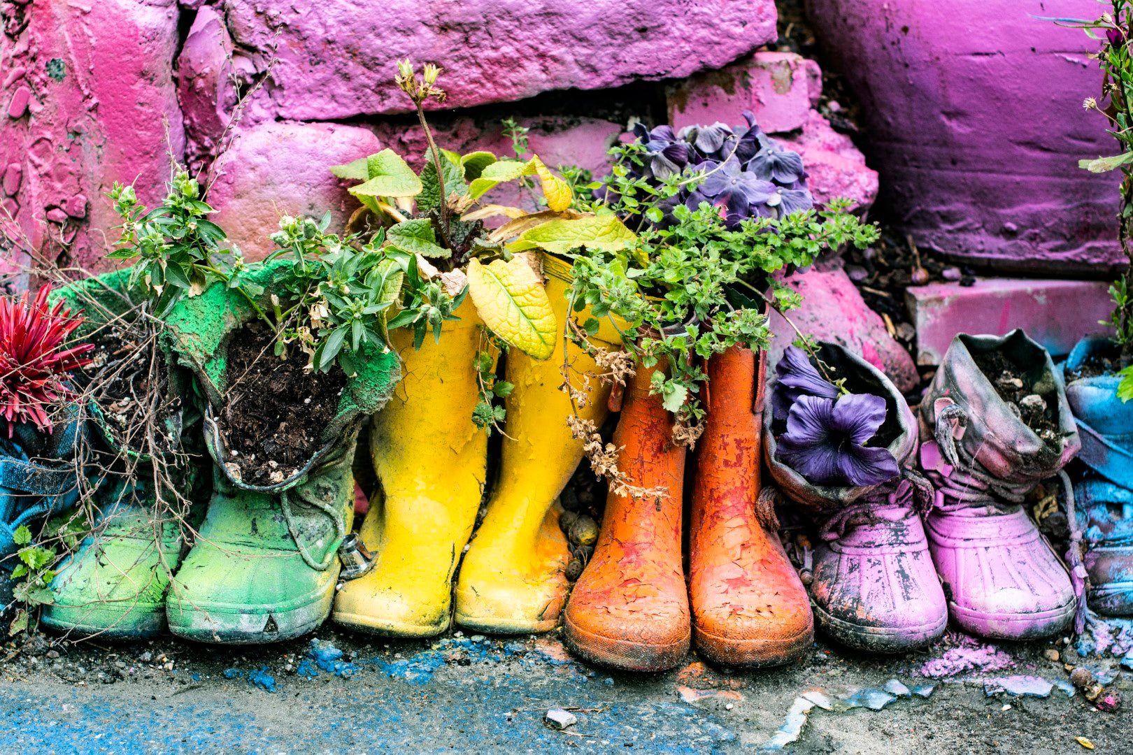 Diamond painting af farvede gummistøvler med planter i. Lyserød væg i baggrunden.