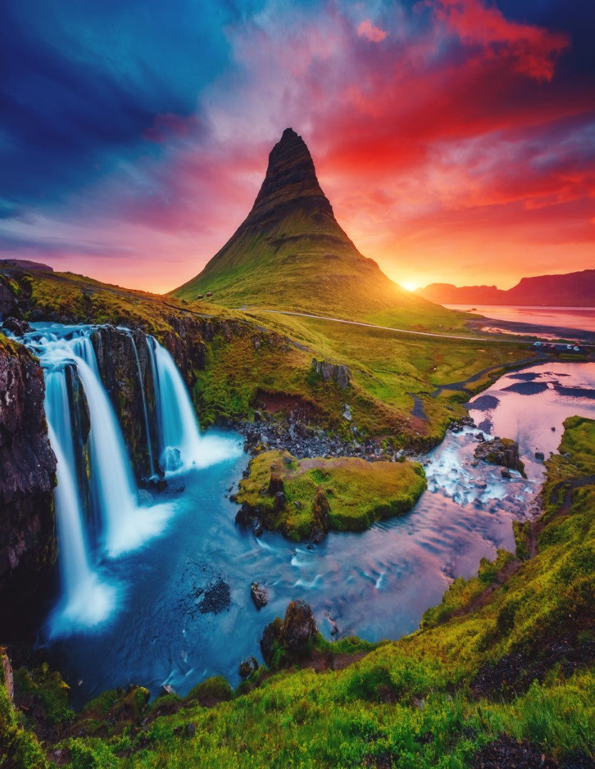 Det höga, symmetriska berget står majestätiskt i kvällssolen, medan vattenfallen störtar ner i det klara vattnet nedanför.